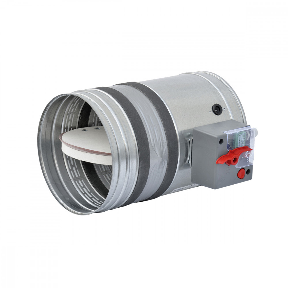 Registres coupe-feu certifiés CE, installés sur les conduits pour couper l’air en cas d’incendie, avec option de servomoteur ou électroaimant.