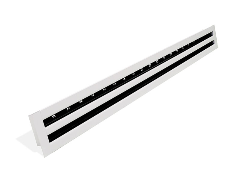 Diffuseurs linéaires avec déflecteurs noirs (standard) ou blancs mats RAL 9016 (DLF/DW).