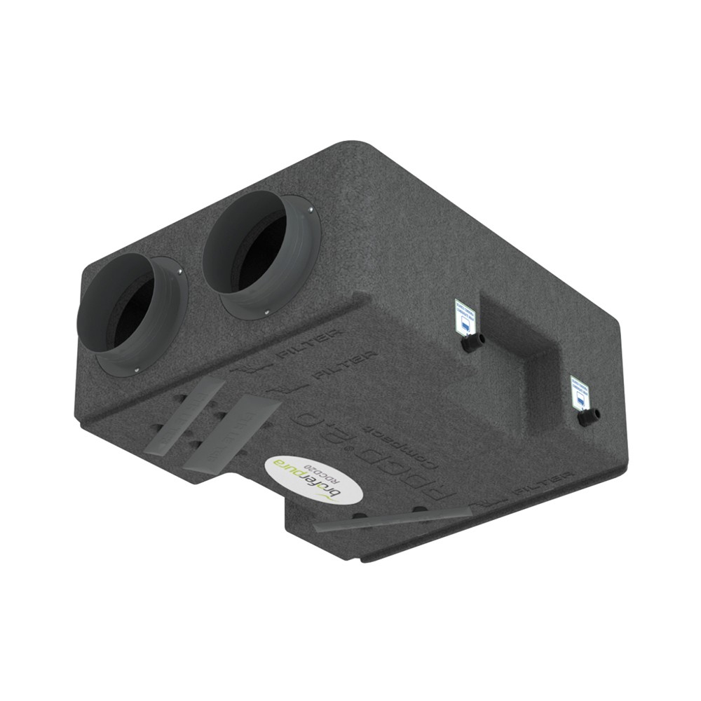 Module de récupération de chaleur sans ventilateurs, avec échangeur à contre-courant entièrement en plastique.